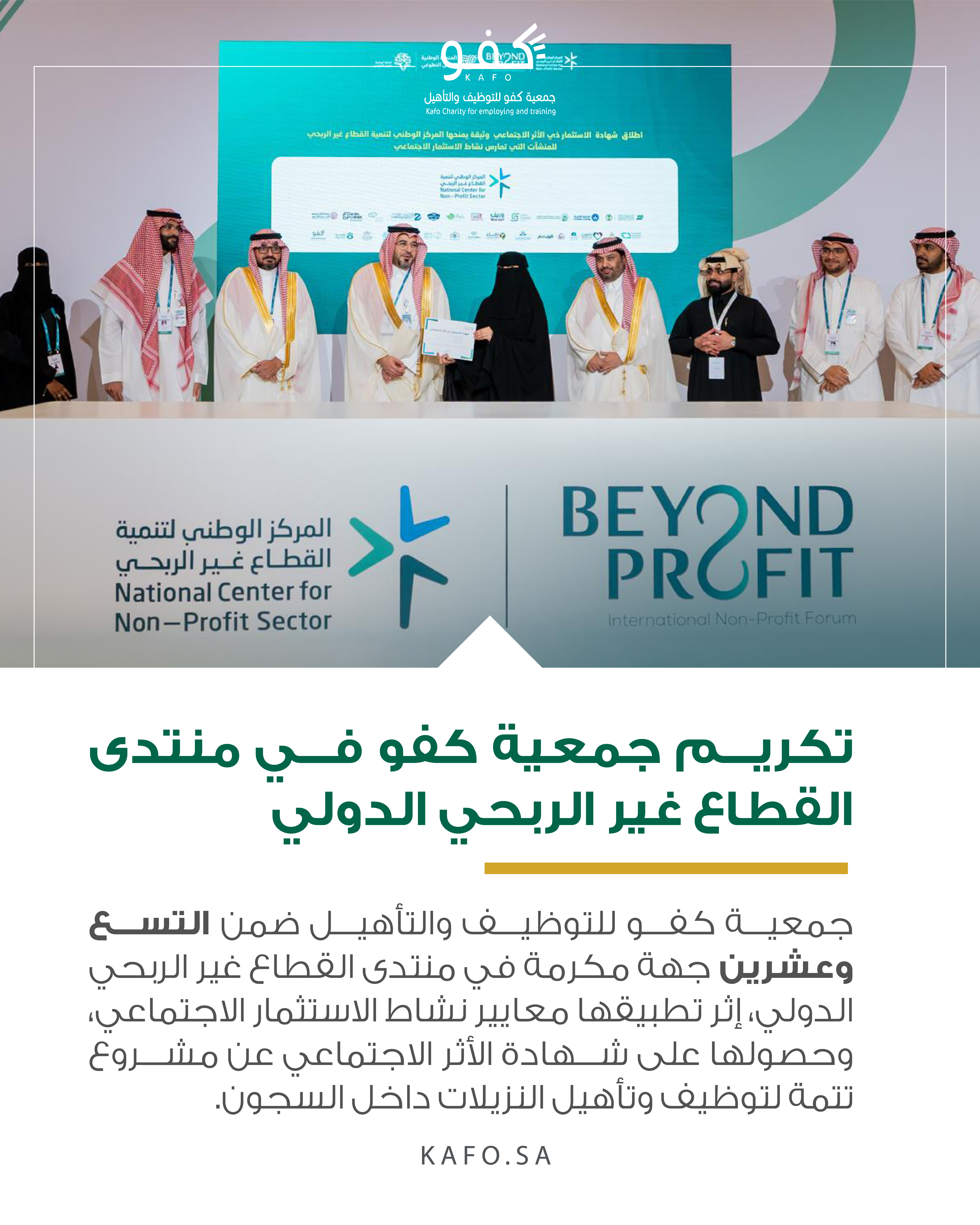 وقد حظيت جمعية كفو للتوظيف والتأهيل بتكريم من رئيس المركز الوطني لتنمية القطاع غير الربحي سعادة الأستاذ/ أحمد بن علي السويلم ضمن تسع وعشرين جهة مُكرمةً إثر تطبيقها معايير نشاط الاستثمار الاجتماعي، وحصولها على شهادة الاستثمار ذي الأثر الاجتماعي في نسختها الأولى، وذلك عن مشروع تتمة لتوظيف وتأهيل النزيلات داخل السجون، وقد مثل الجمعية في التكريم المديرة التنفيذية أ.غادة عبدالله البداح،